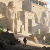 Egyptian temple, featuring columns and statues that are typical of such structures. There's