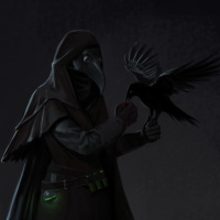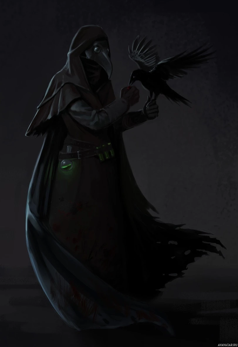 plague doctors who were used to help protect physicians from the spread of the bubonic plague. The background is very dark, which enhances the overall somber and macabre mood of the image. The style of the artwork gives it a gothic or horror-themed feel, and it could be related to themes of death, disease, or supernatural entities in