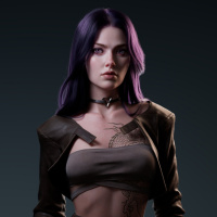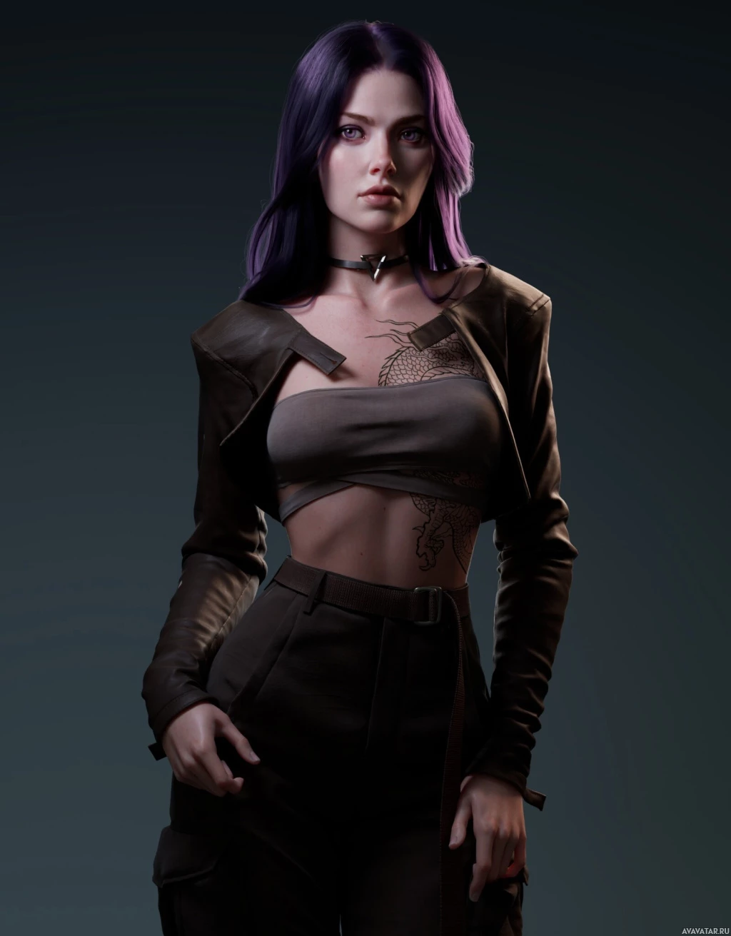 The image shows a female character with purple hair, wearing a brown jacket and high-waisted pants. She has a tattoo on her left shoulder and is holding what appears to be a gun in her right hand. The style of the character suggests she might be from a video game or a stylized representation of a modern warrior or agent.
