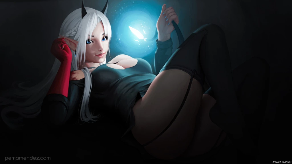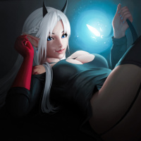 an indoor setting with dim lighting, which adds to the atmospheric quality of the illustration.