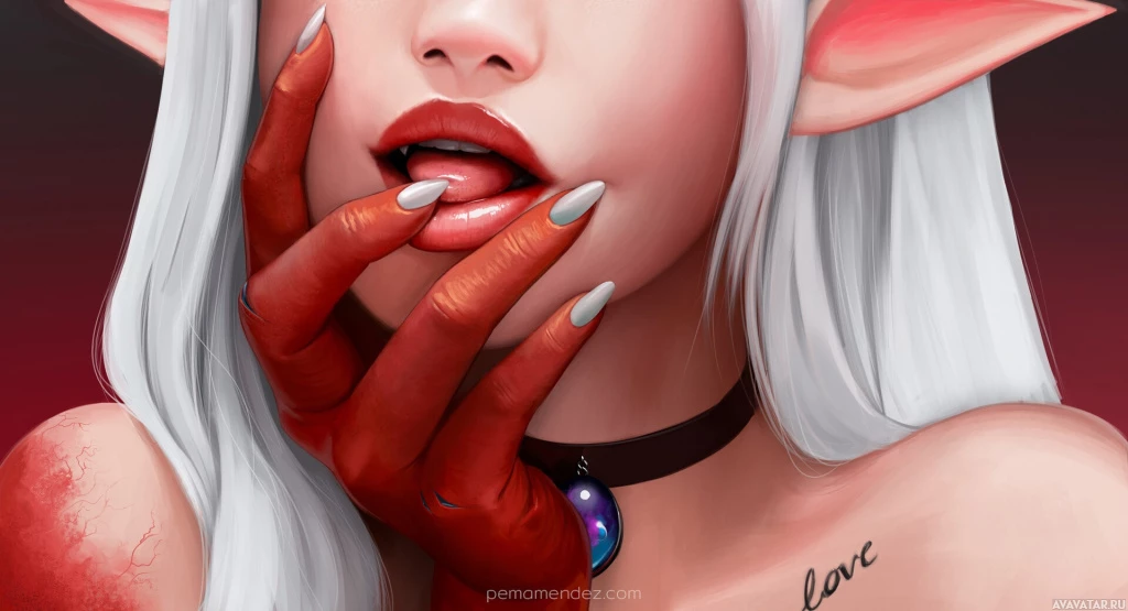 a female character with white hair and pointed ears, characteristic of elves in folklore and fantasy literature. Her expression is one of surprise or shock as she holds her hand to her mouth. She has striking