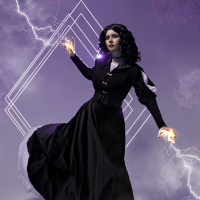 a black dress with a high collar, holding magical elements in each hand and surrounded by an ethereal purple mist or smoke, suggesting she might be casting a spell. The character's pose and expression convey intensity and focus on the magic being performed.