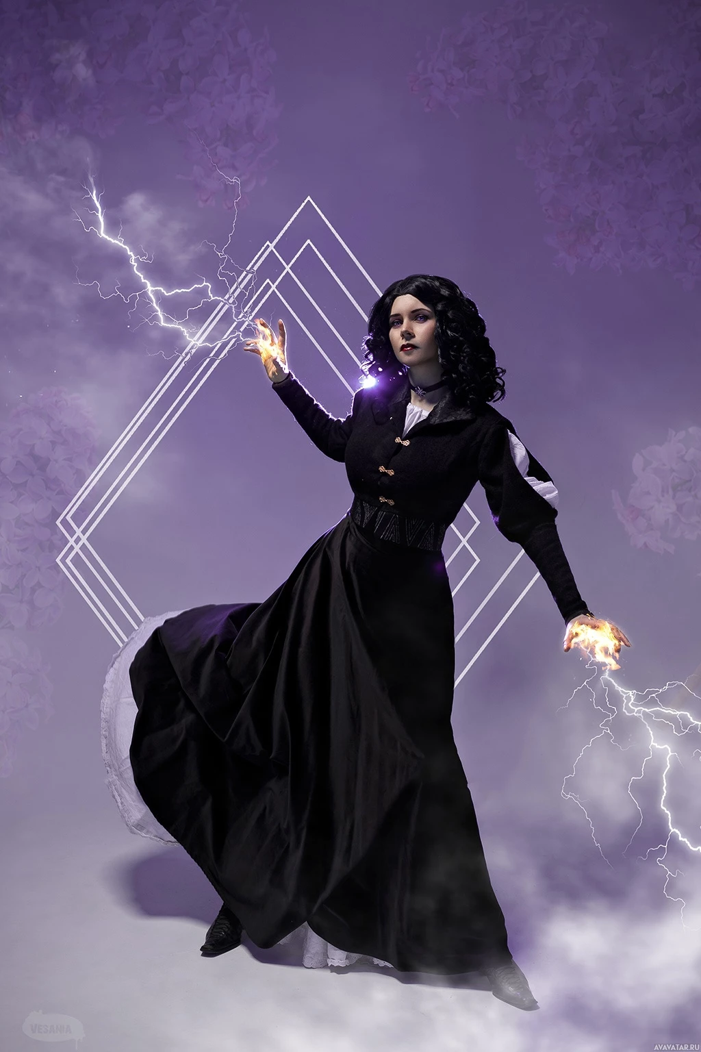 The image features a character cosplaying as Yennefer from the "Witcher" series, which includes books and