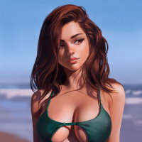 На картинке изображен иллюстрированный персонаж - рыжеволосая девушка в зеленом бикини. Кажется, что она стоит на песчаном пляже на фоне океана под ясным небом, что наводит на мысль о солнечном дне. Произведение искусства детализировано и реалистично, изображая объект в безмятежной и расслабленной позе, которая передает ощущение спокойствия.