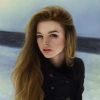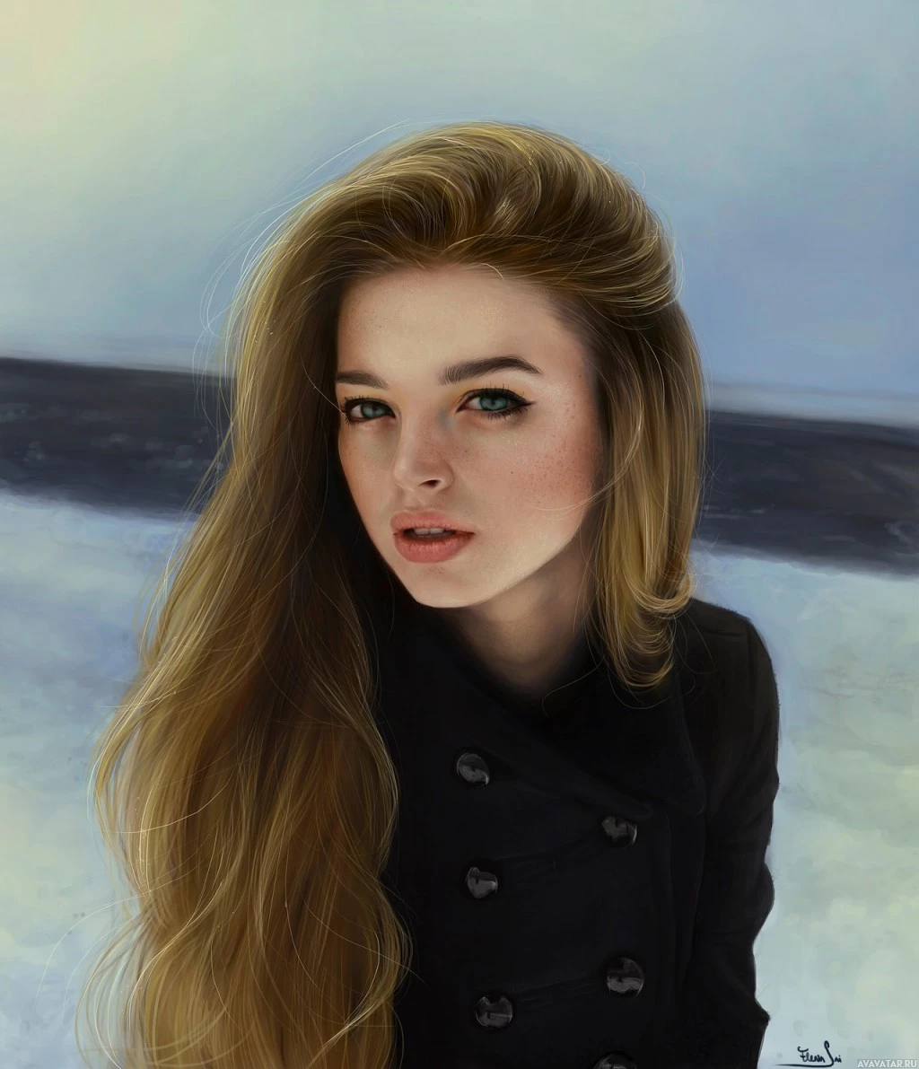 blue eyes and appears to be gazing off to the side with a subtle smile, giving her an air of thoughtfulness or introspection. She's wearing what looks like a black coat, which adds