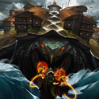 a coastal town or village. The overall atmosphere suggests a dramatic and potentially dangerous encounter between human and fantastical elements.