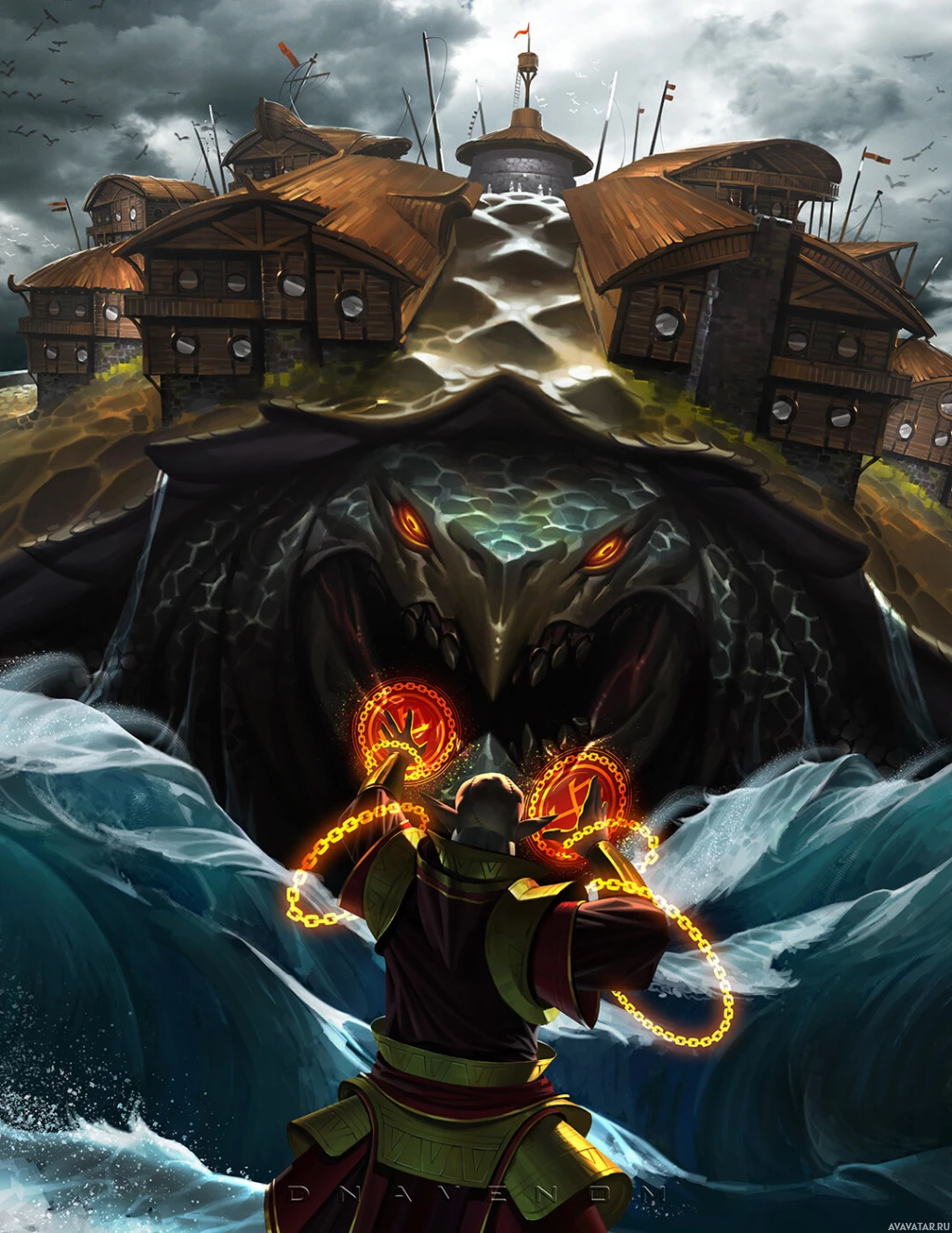 a fantasy scene where a person is standing in front of an angry sea creature. The creature has the appearance of a large, menacing turtle with sharp teeth and