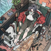The image shows an illustrated scene of a girl sitting in a room filled with various objects. She appears to be holding a weapon, possibly a gun or similar device. There are multiple books and other items scattered around the room, suggesting a lived-in and perhaps chaotic environment. The artwork includes vibrant colors and intricate details, giving it a dynamic and interesting feel.