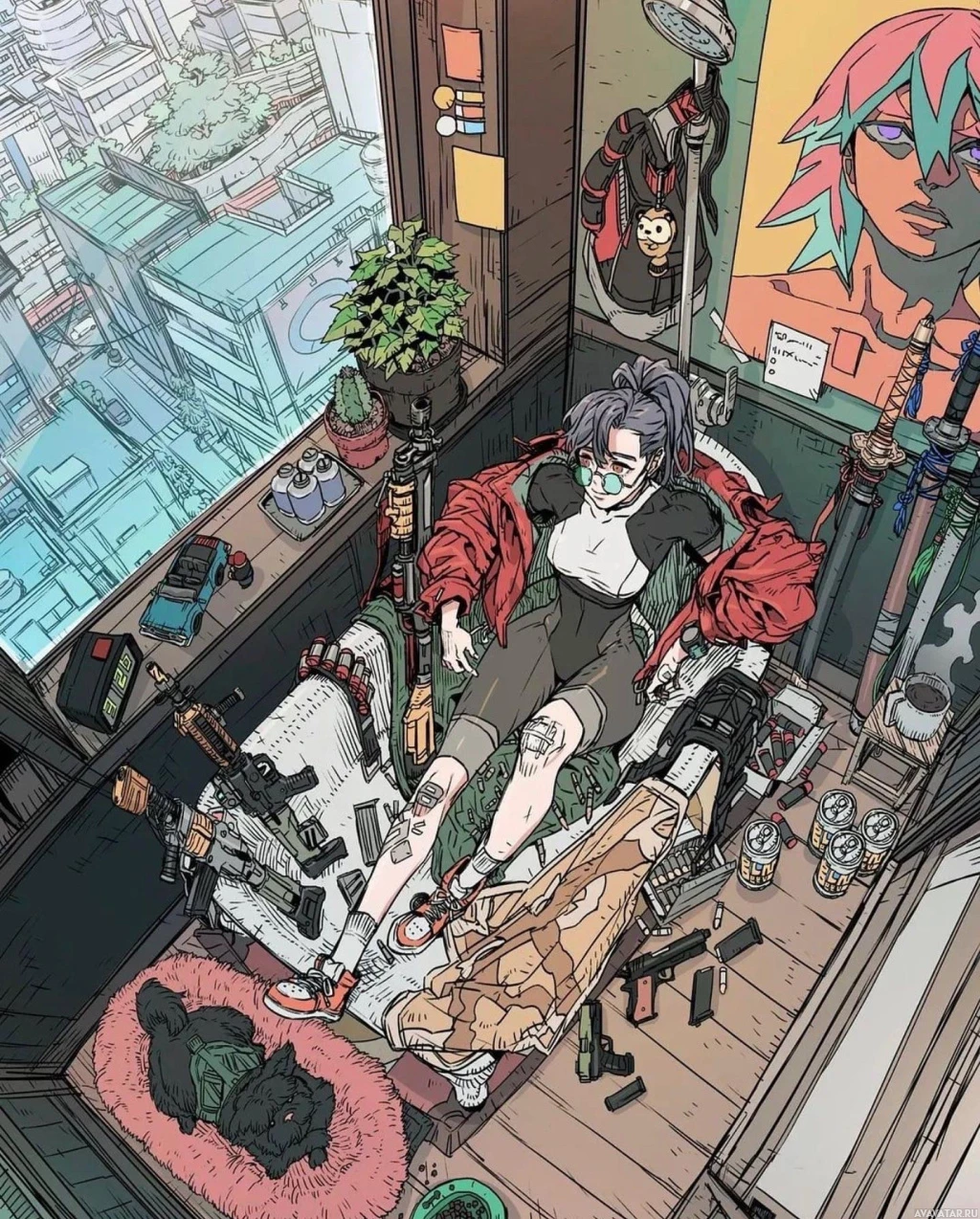 На картинке изображена девушка, сидящая в комнате, заполненной различными предметами. Кажется, что она держит в руках оружие, возможно, пистолет или подобное устройство. По комнате разбросано множество книг и других предметов, что наводит на мысль о обжитой и, возможно, хаотичной обстановке. В оформлении использованы яркие цвета и замысловатые детали, что придает ему динамичный и интересный вид.