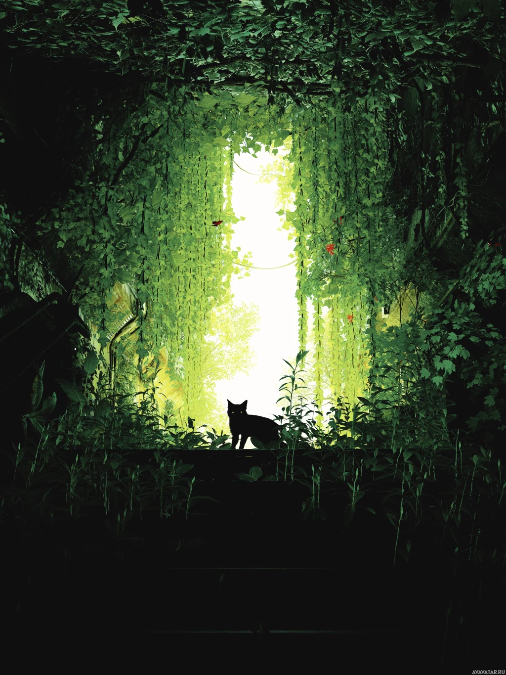 an enchanted forest. The cat's eyes are glowing, suggesting it might be a mystical or supernatural creature, and the environment around it looks dense with greenery and vines hanging down from above. The sunlight filtering through the foliage creates a mysterious and somewhat eerie atmosphere.