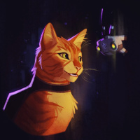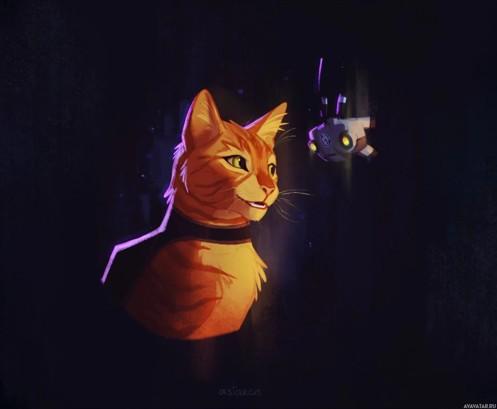 На картинке изображен анимированный персонаж-кошка из видеоигры "Stray". Кажется, что кошка смотрит на маленького робота или летательный аппарат светящимися глазами. В кадре царит ночное время, о чем свидетельствует темнота на заднем плане и фиолетовый оттенок сцены.