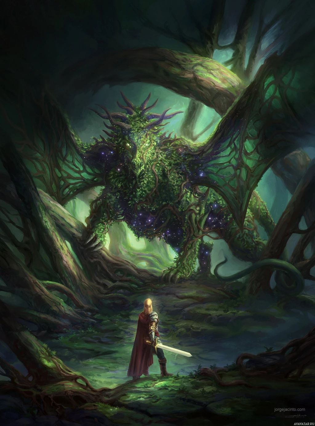 a fantasy scene with a sword-wielding warrior standing in front of a creature that resembles both a dragon and a plant. This