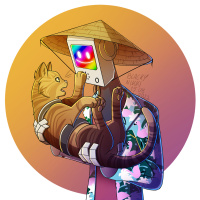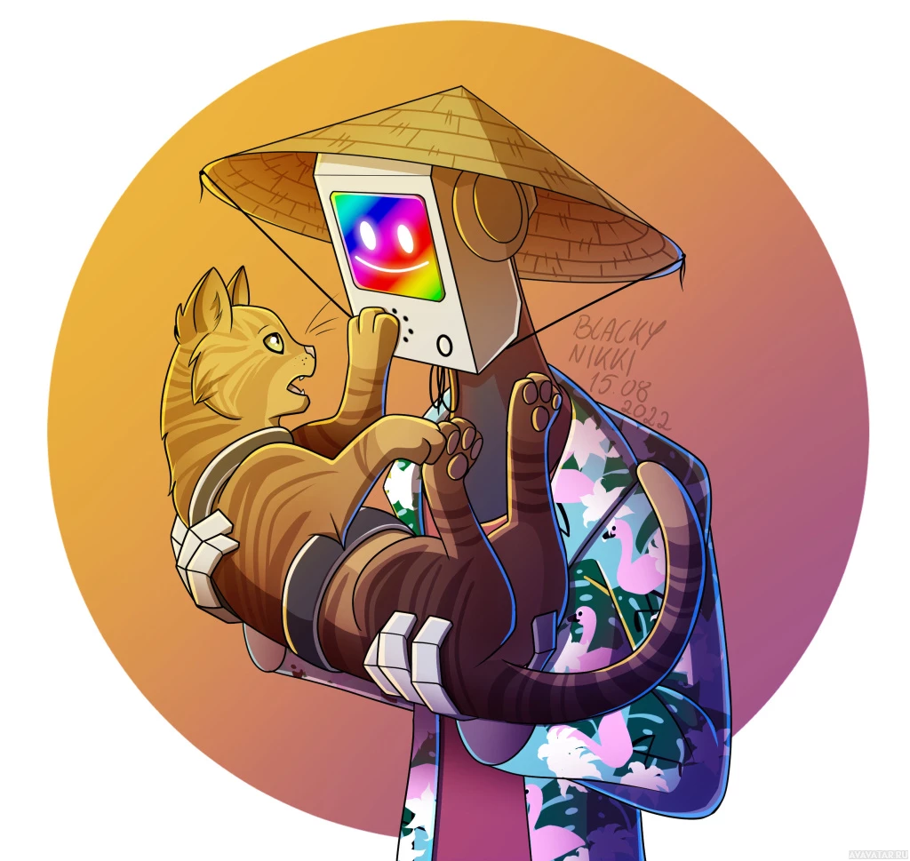a straw hat and holding a cat in its arms. The robot has a large, colorful screen for a face and is dressed in