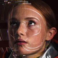 virtual reality, or AI. The woman is dressed in a futuristic astronaut suit, which may imply she's part of an exploration mission or