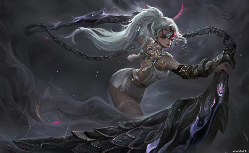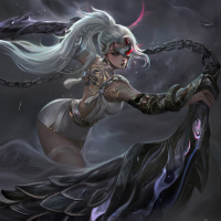 a female character with white hair, who appears to be from a fantasy setting. She is wearing armor and holding what looks like a weapon or staff. Her expression is intense and focused as she gazes forward. The background has a dark,