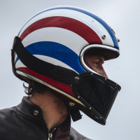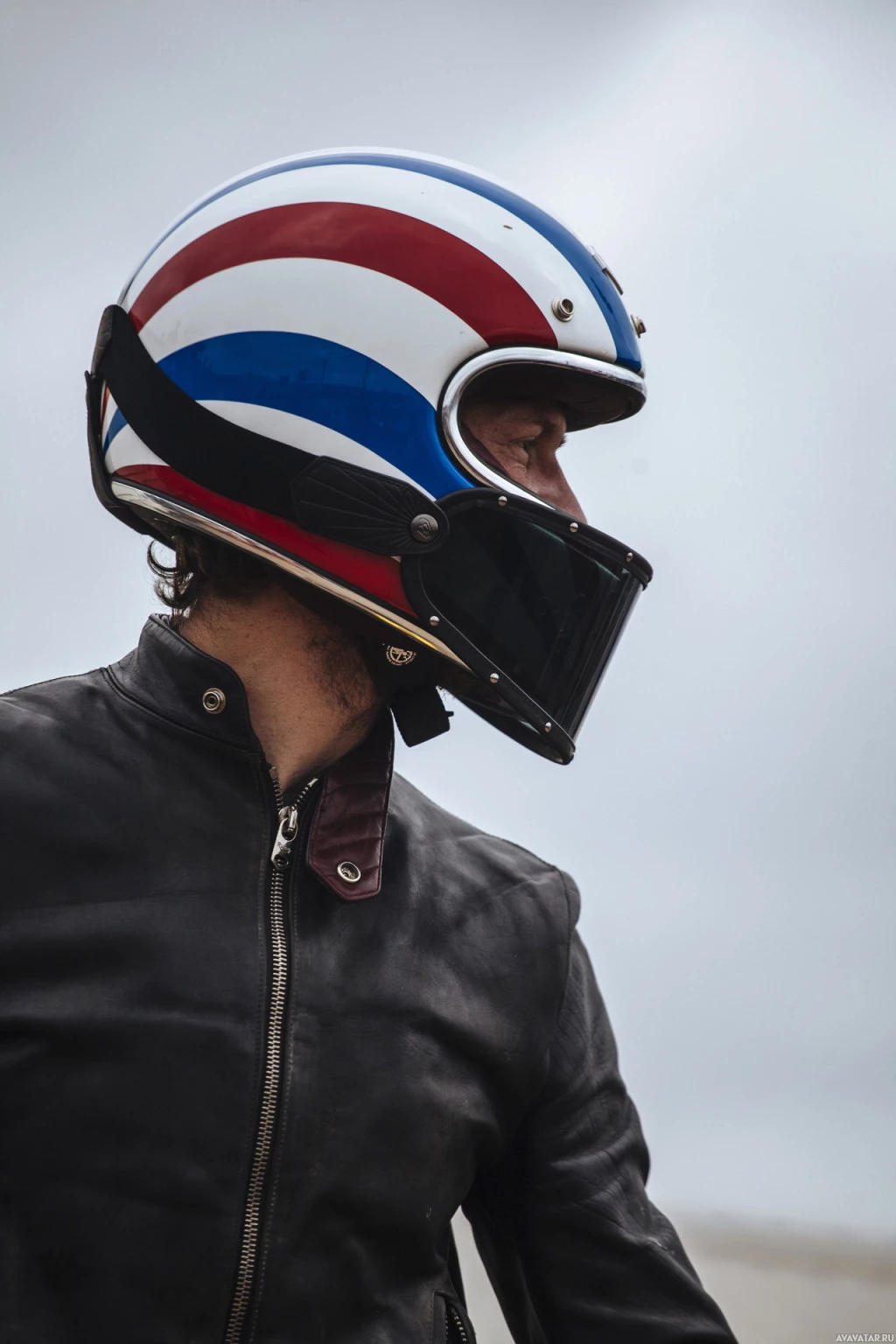 a leather jacket, which adds to the impression of a motorcyclist or someone engaged in an activity related to motorcycling. The background is not very detailed but suggests