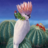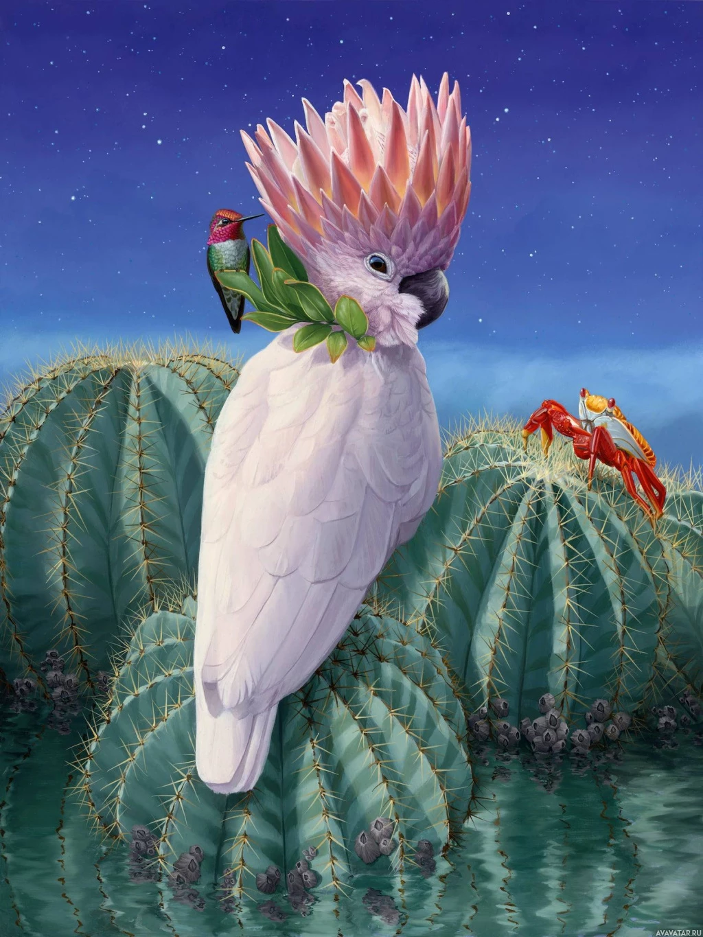 a prominent crest, indicating it might be a type of parrot with such adornment. In the background, there is another bird, which could be a hummingbird based on its shape and size. The setting appears to be in