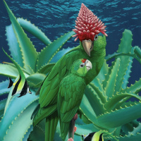 The image depicts two parrots, a parent and a chick. They are surrounded by various marine life forms such as coral and fish. This is an illustration, not a photograph.