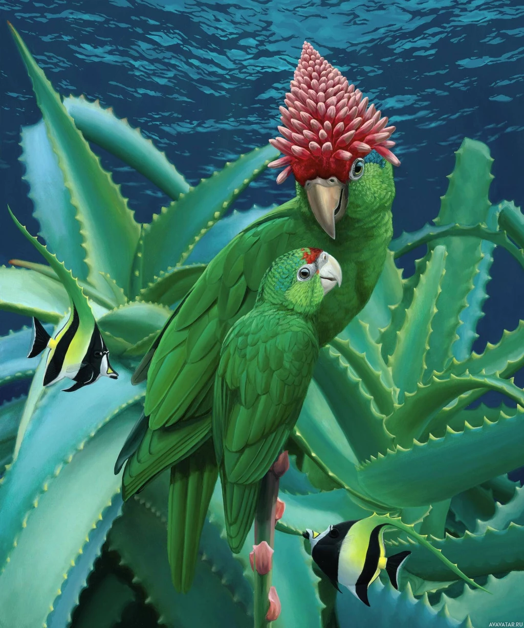 На картинке изображены два попугая, самец и птенец. Они окружены различными морскими обитателями, такими как кораллы и рыбы. Это иллюстрация, а не фотография.