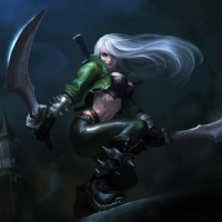 white hair. She is holding two swords crossed in front of her body, suggesting that she is ready for combat or performing an attack maneuver. The setting appears to be nighttime with a dark sky, which contributes to the dramatic atmosphere often associated with