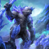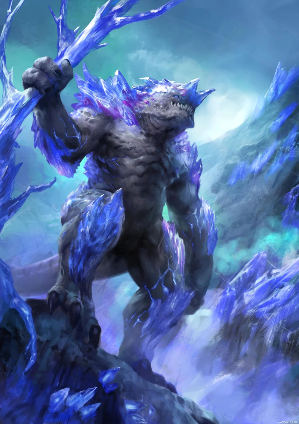 a muscular build, but also features human-like arms and hands gripping a piece of ice or crystal. It stands in