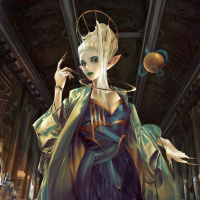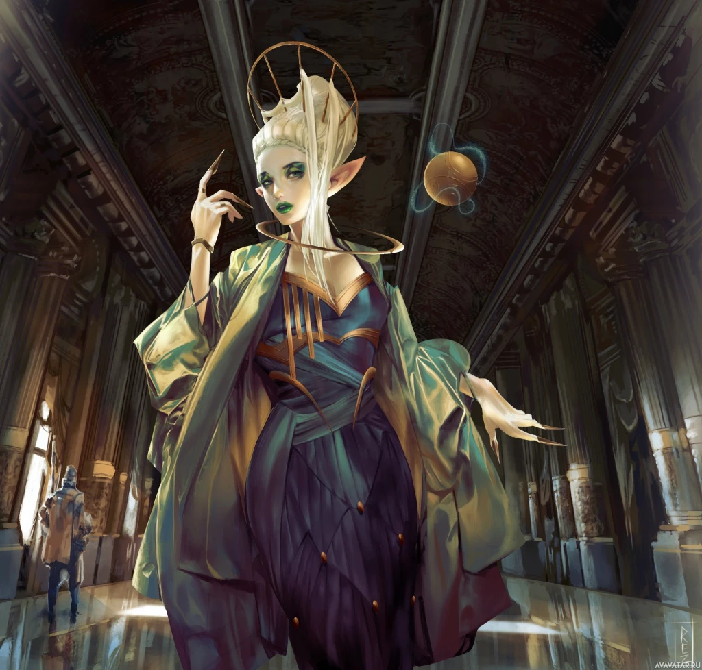 a throne room given the grand architecture and the presence of another figure seated on a throne-like chair in the background. The elf is dressed in long, flowing robes that suggest a formal or ceremonial outfit, with a cape that has