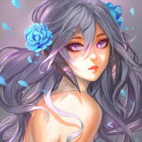 purple hair with blue flowers in it, suggesting an anime or manga influence in her design. Her makeup includes