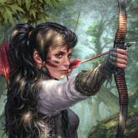a young woman with long, dark hair and striking red eyes. She is dressed in what appears to be fantasy-themed attire, including a bow and arrow that she is holding as part of her outfit. Her expression suggests focus or determination. The background depicts a forested environment with