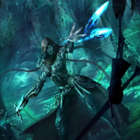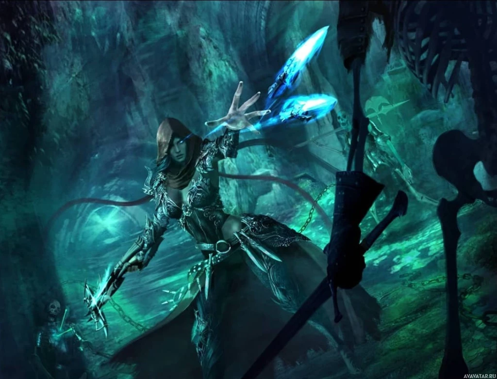 a fantasy character who appears to be female. She is holding a crossbow and has