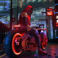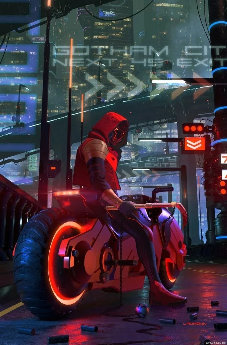 The image features a character wearing a hooded outfit, sitting on a futuristic-looking motorcycle in
