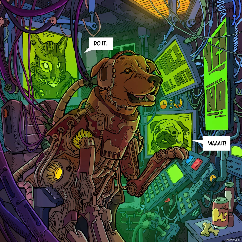 electronic equipment and wires, giving an impression of high-tech machinery and interfaces. There's a caption that reads "DO IT," followed by "WAAAAA!" indicating a dialogue or instruction given to the dog, which humorously reflects on the common saying "do it" but instead results in