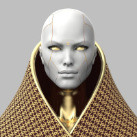 a humanoid robot with a stylized, futuristic appearance. It has a head that resembles human features, such as eyes and hair, but the details are rendered in a way that suggests
