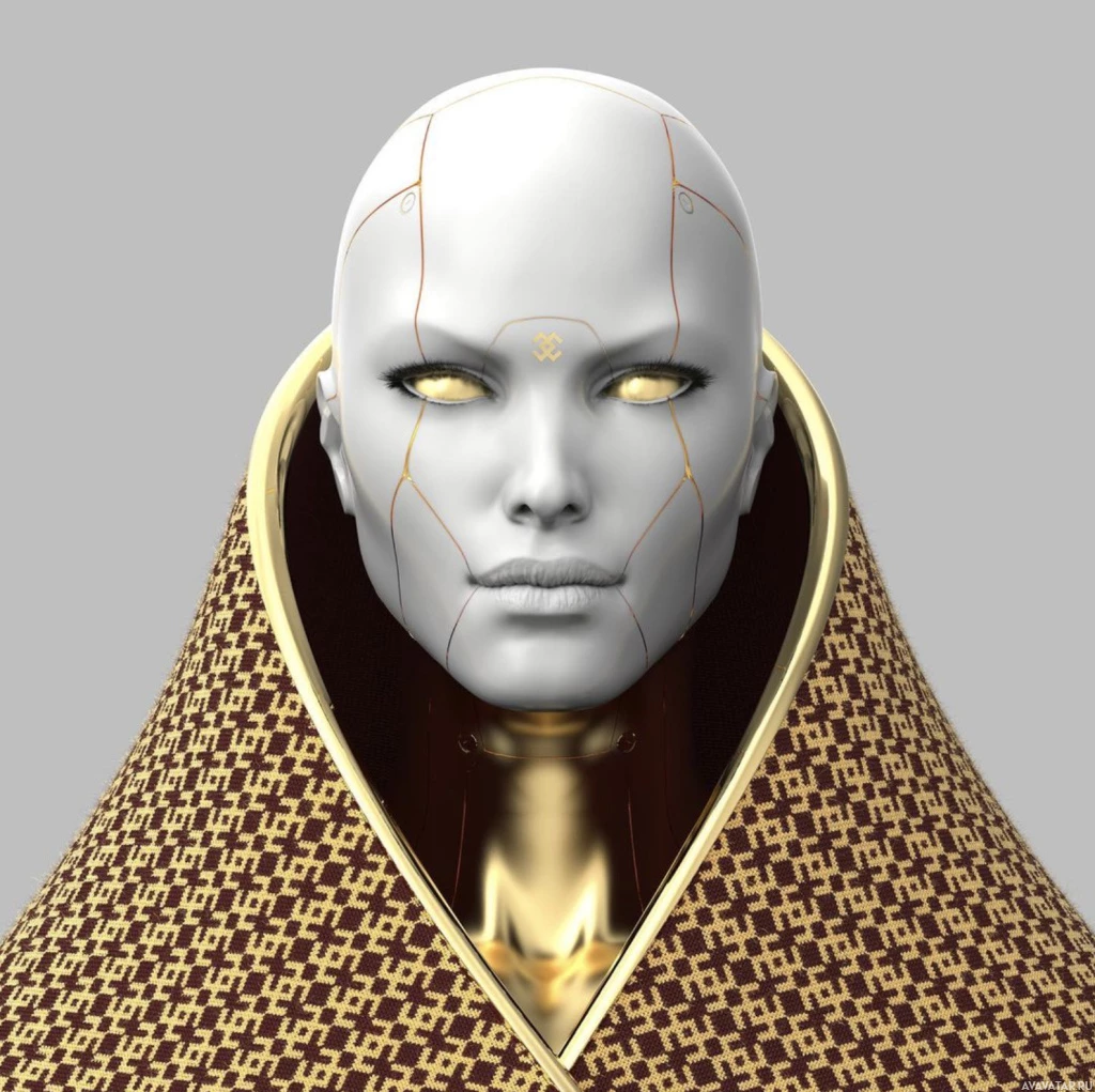 advanced technology and possibly an android design. The robot is wearing a gold cloak or mantle over its shoulders, which adds to the regal or ceremonial