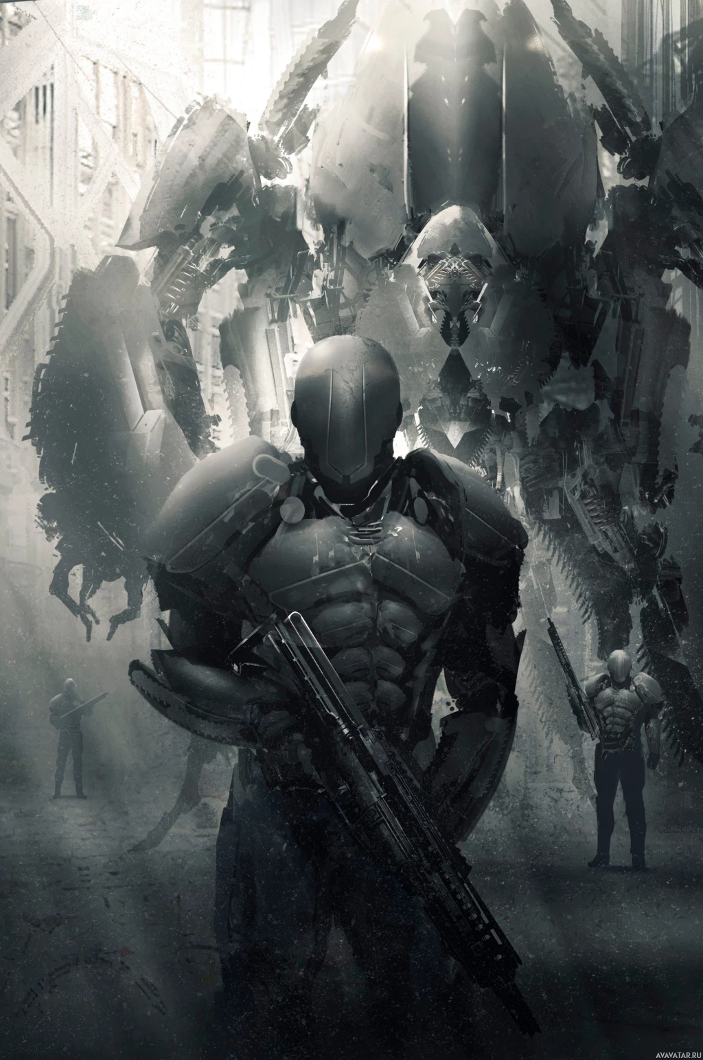 a protective suit and is holding a gun, which is typical for soldiers engaged in combat situations. The art style suggests it might be concept art for