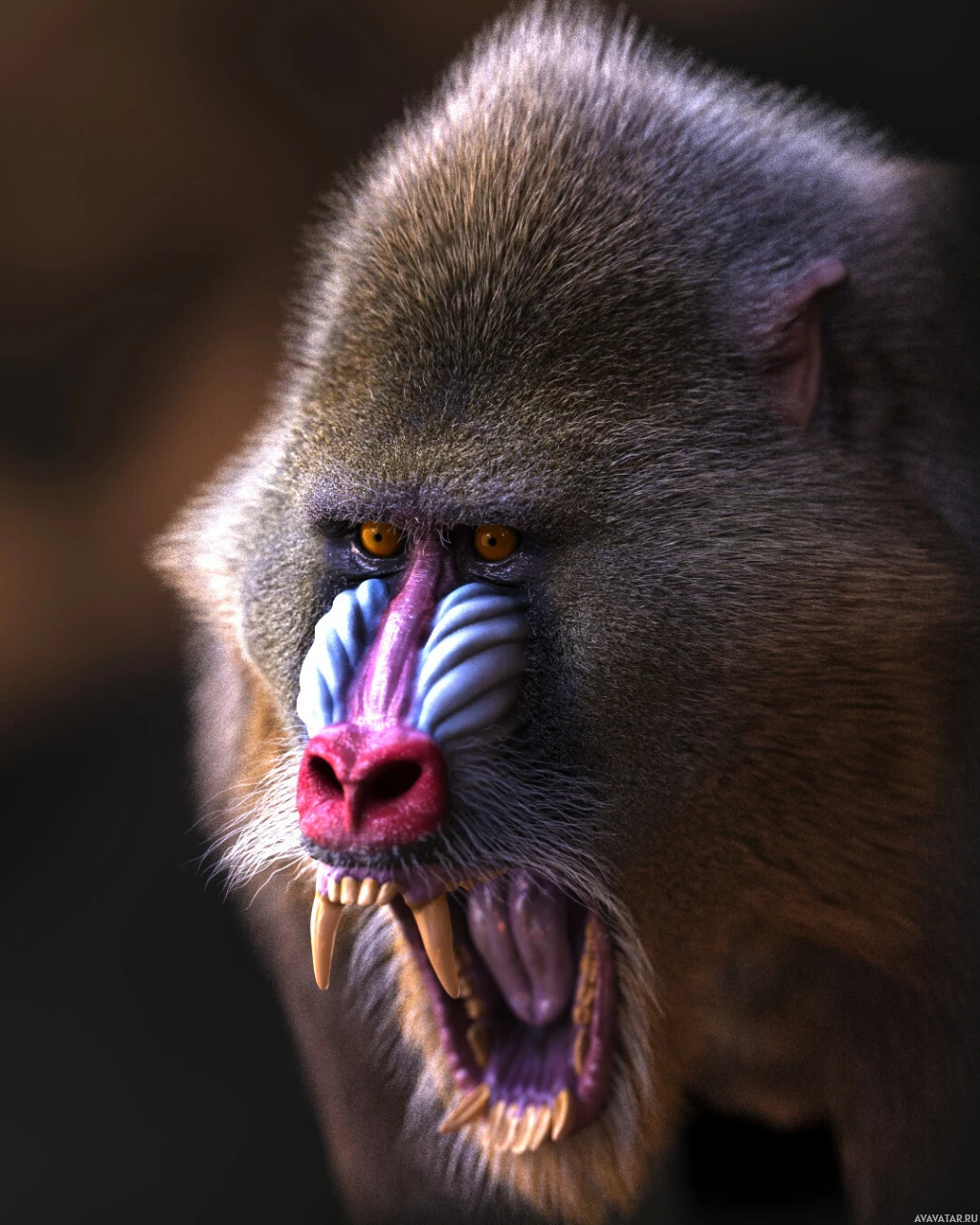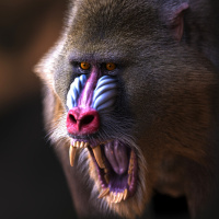 The image features a close-up of an animal that appears to be a baboon. It is characterized by its fur, the coloration on its face, and the overall shape of its head which is not typical for monkeys, but rather resembles more closely a baboon's appearance. Baboons are known for their distinct
