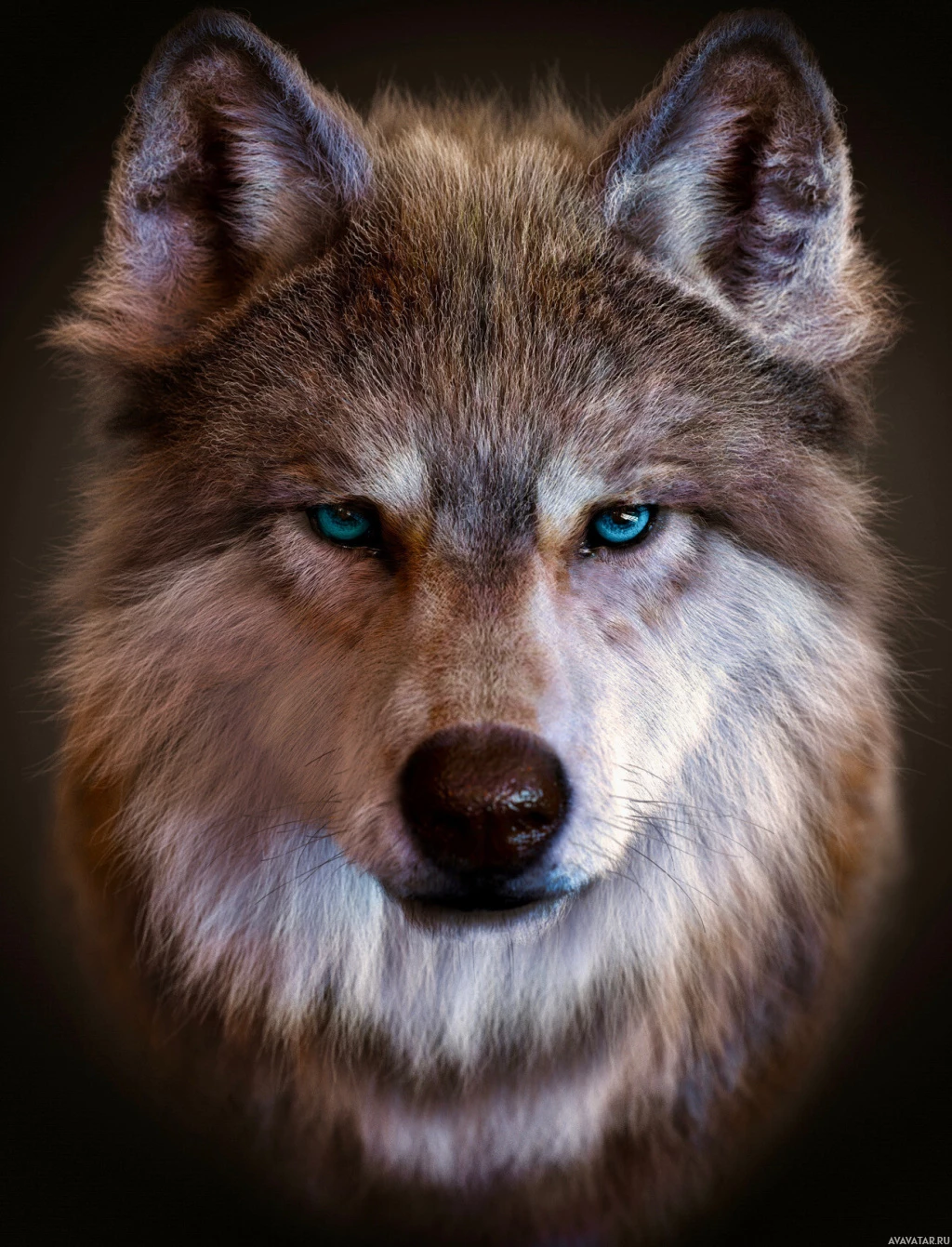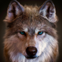 На снимке изображена голова волка с сосредоточенным взглядом. У волка густой серовато-коричневый мех, а глаза ярко-синего цвета, которые выделяются на темном фоне.