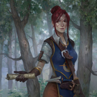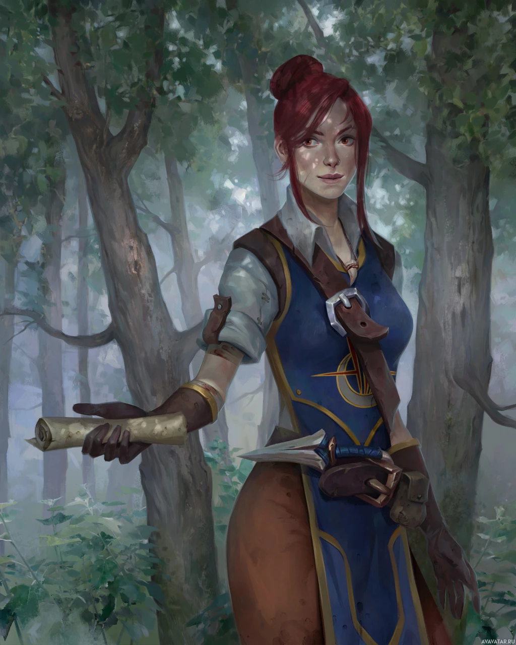 На картинке изображен персонаж женского пола с рыжими волосами, одетый в доспехи и держащий в руках что-то похожее на оружие или инструмент. Она стоит посреди леса. Художественное оформление детализировано и отражает тему фэнтези или приключений, обычно ассоциирующуюся с девушкой, которую описывают как "искательницу приключений" или представительницу жанра фэнтези.