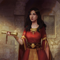 dark hair and is holding what appears to be a scroll or parchment, which they are unrolling. They are set against the backdrop of an arched entryway that suggests a setting in