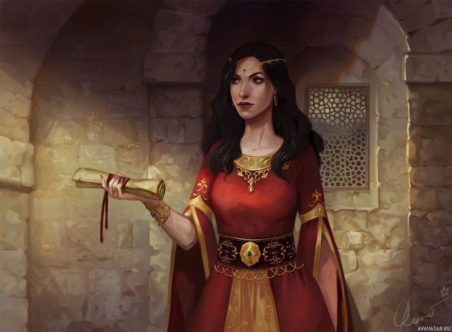 a red garment with gold trim and a headdress, which adds to the ancient feel of the image.