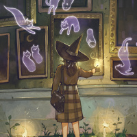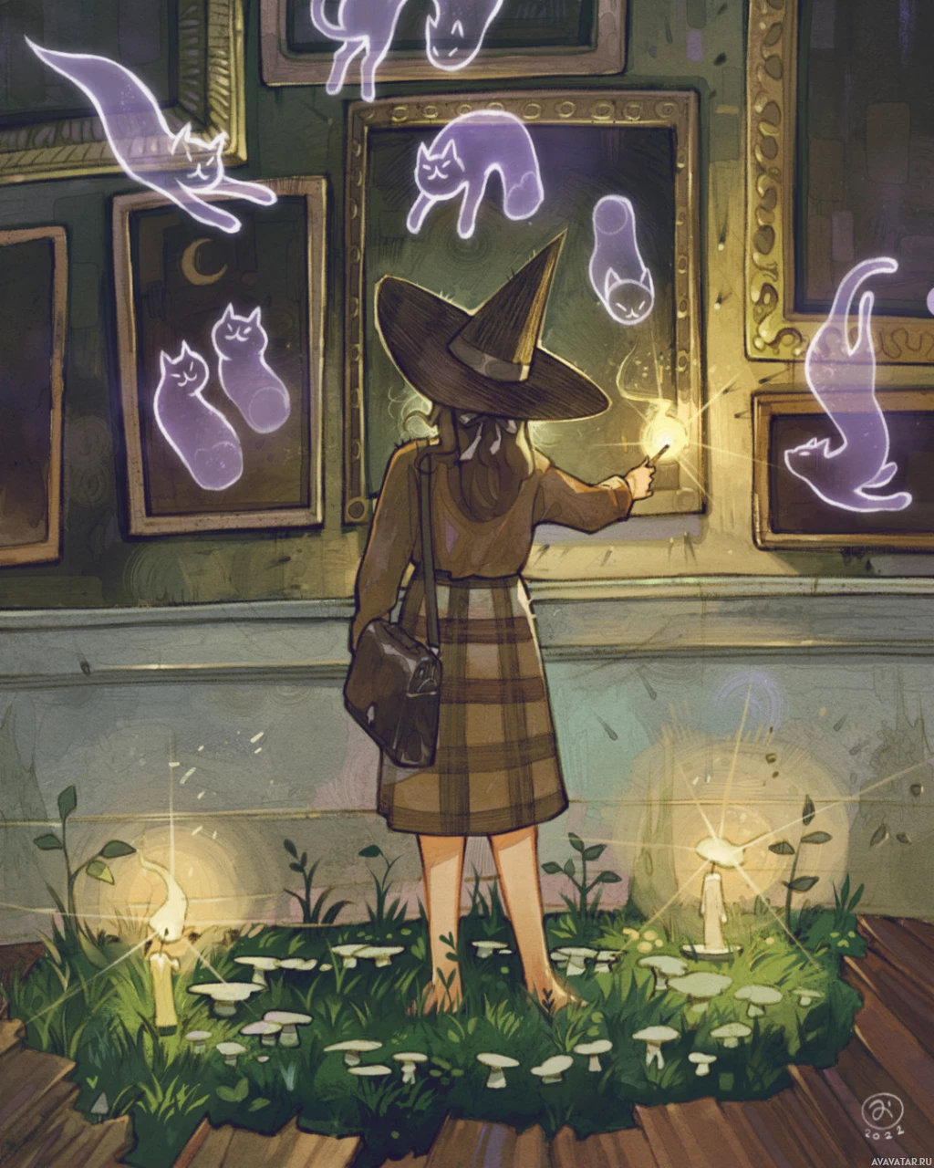 a whimsical scene with a witch character. From behind, the figure is wearing a hat that resembles a witch's hat and appears to be casting spells or creating an illusion related to cats, as there are