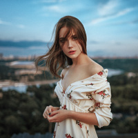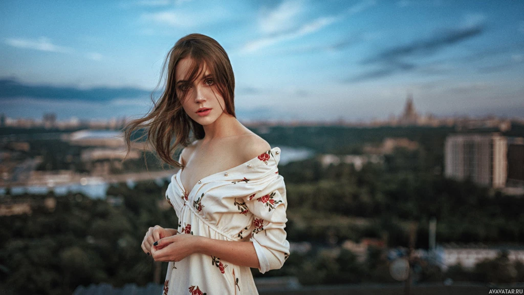 На картинке молодая женщина стоит на фоне городского пейзажа во время восхода или заката солнца. На ней топ с открытыми плечами в цветочек, а волосы уложены свободными волнами. На картинке запечатлен безмятежный момент, когда кажется, что она смотрит вдаль, возможно, размышляя или просто наслаждаясь видом.