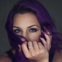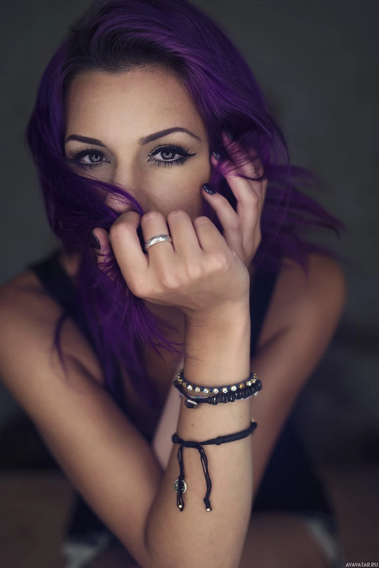 purple hair and an overall pinkish tone. The individual is wearing multiple bracelets on their right wrist, has