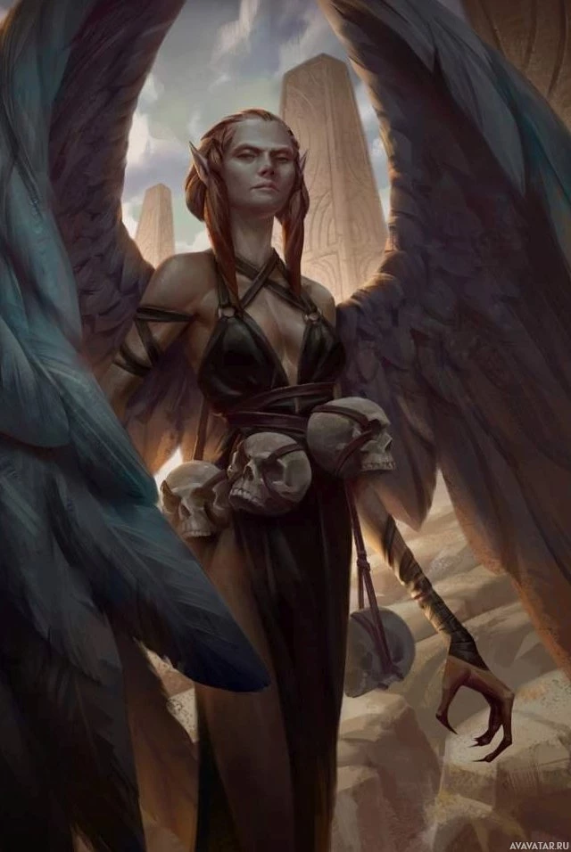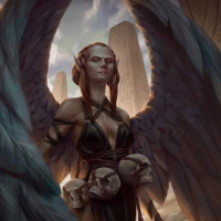The image depicts a fantasy-themed character. This character appears to be an angelic being with feathered wings, standing amidst rock formations that suggest a rugged, perhaps