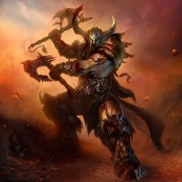 На картинке изображен фэнтезийный персонаж-воин из игры Diablo. Этот персонаж держит в руках топор и, кажется, стоит в боевой стойке на фоне, который наводит на мысль об огненной, адской обстановке.