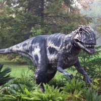 The image shows a statue of a Tyrannosaurus Rex, which is an extinct species known as a dinosaur. The sculpture appears to be realistic and is situated in what looks like a park or garden setting with vegetation around it.