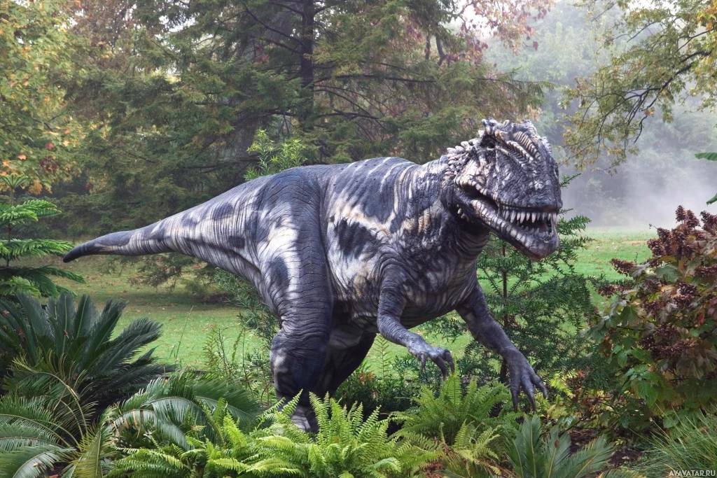 На картинке изображена статуя тираннозавра Рекса, который является вымершим видом, известным как динозавр. Скульптура кажется реалистичной и расположена в парке или саду с растительностью вокруг него.