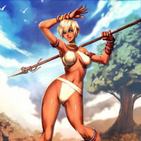 white hair, is wearing some sort of bikini-like armor, and is holding a lance. She stands in a combat stance on what looks like a sandy or