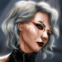 science fiction elements: she has a robotic or cybernetic appearance, possibly suggesting a futuristic setting or storyline where technology and humanity intersect. Her attire appears to be designed for functionality or as part of her
