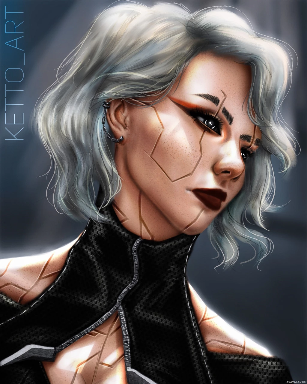 cybernetic enhancements, which could imply she might have superhuman abilities or is part of a specialized group within the science fiction universe. The artwork has been signed "ketkat" and includes the text "KETKAT ART" in the bottom right corner, indicating the artist's name and their association with the piece.