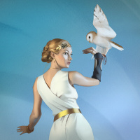a white owl on her left arm. The backdrop is a simple, soft